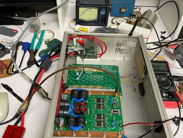 It uses a pallet from VK3AMP with 4xMRF-300. 5Watt in, 1200 W out.